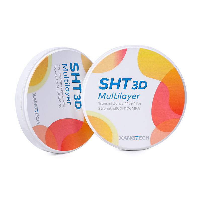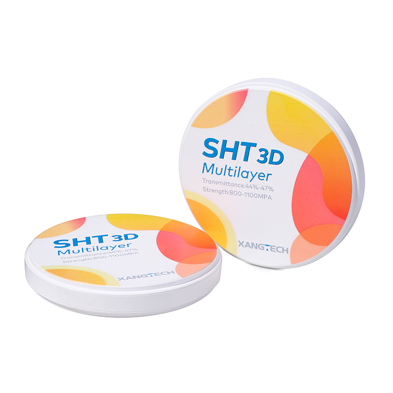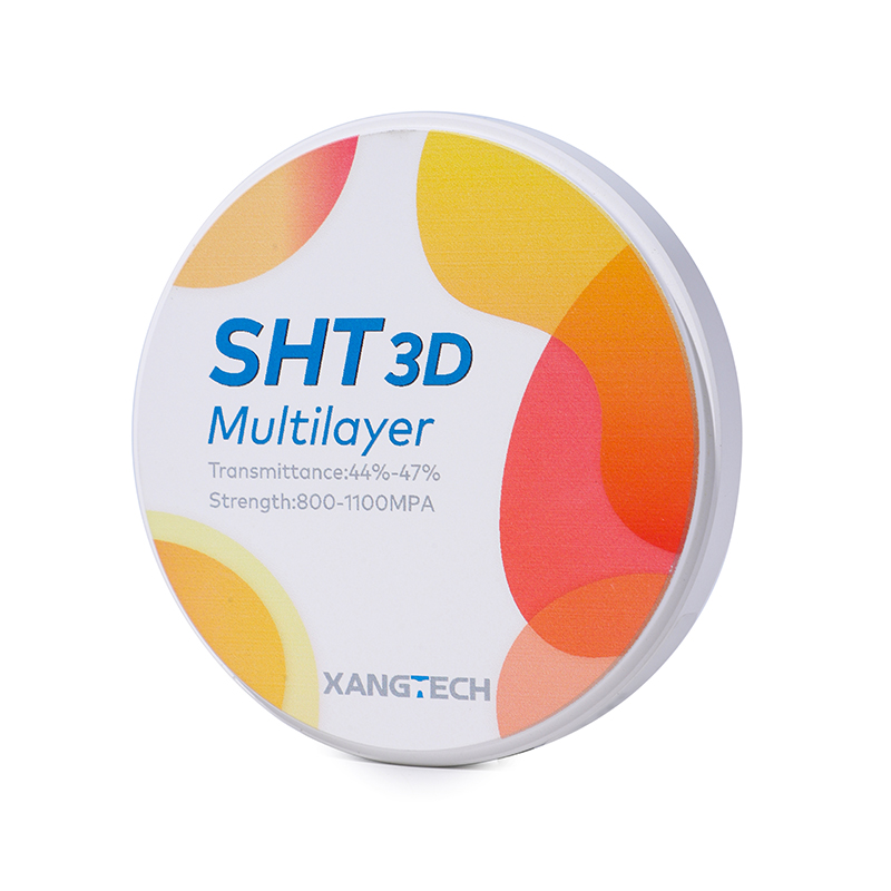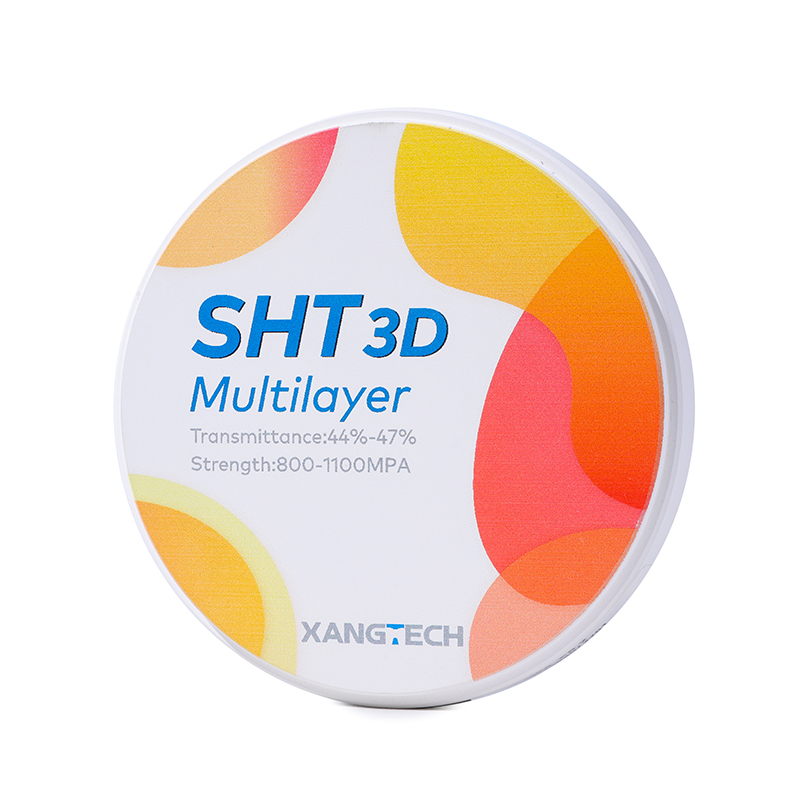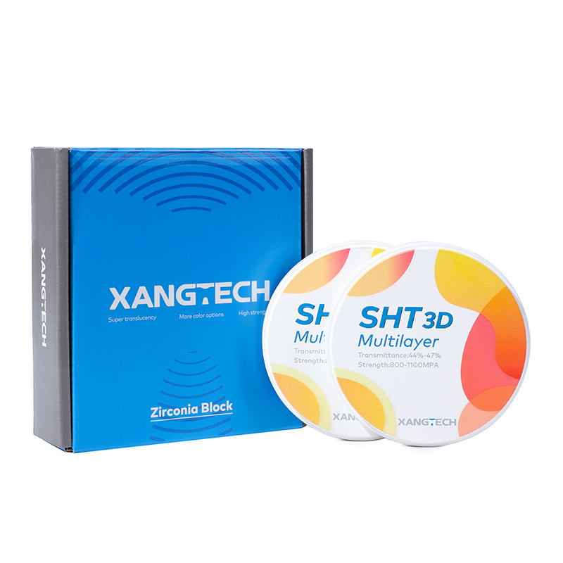 XANGTECH SHT 3D multilayer zirconia block is an innovative dental material for high-end aesthetic restoration, designed for clinical needs that pursue the ultimate natural beauty and excellent performance. It adopts advanced seven-layer pre-dyeing gradient technology and four-layer superposition process to accurately control color distribution and transmittance, presenting a natural color transition from 47% at the incisal end to 44% at the neck, restoring the physiological color and rich layers of natural teeth to the greatest extent, and achieving a highly transparent and realistic aesthetic effect. The product does not require additional dyeing and can be repaired in one step, which significantly simplifies the technician’s operation process and improves work efficiency. At the same time, it reduces the risk of color difference caused by artificial dyeing, making the repair process more efficient and safe.